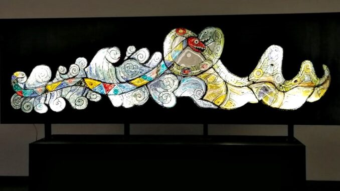 Técnica: Escultura en vitrofusión, grisalla y fierro. Materialidad: Vidrio y fierro. Medidas: 1 x 3,20 m. Obra representa la lucha de las serpientes Kaykayfilu (serpiente del agua) y Trengtrengfilu (serpiente de la tierra), donde TrengTreng es quién protege al pueblo Mapuche de la existencia, manifestando la lucha permanente de los pueblos del bien y del mal y su resistencia. El trabajo en fierro que sirve de soporte para la obra principal de la Exposición KIMUN MAPU, fue realizado por el artista visual Germán Ibáñez.