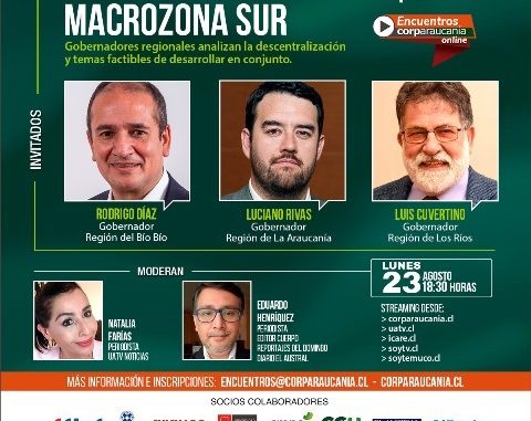 Con la visión de avanzar en este objetivo, los gobernadores de las regiones del Bío Bío, Rodrigo Díaz; La Araucanía, Luciano Rivas; y Los Ríos, Luis Cuvertino, se darán cita este lunes 23 de agosto a las 18:30 horas, en el encuentro online “Empoderar la Macrozona Sur”, el que se transmitirá por Corparaucania.cl y plataformas integradas.