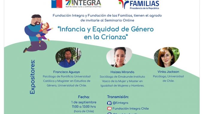 Con el fin de reflexionar en torno a la crianza de las niñas y niños con enfoque de género, Fundación Integra y Fundación de las Familias (Funfa) realizarán, este 1 de septiembre, el seminario on line “Infancia y equidad de género en la crianza, avances y desafíos”.