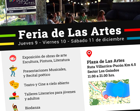 El evento contará con exposiciones de Escultura, Pintura, Vitrales, Poesía, Teatro, Música, Danza, Cine, los días jueves 9, viernes 10 y sábado 11 de diciembre, desde las 11.00 de la mañana hasta las 21.00 horas. Todo esto en el Km 6,5 de la Ruta Villarrica-Pucón; en Plaza de Las Artes.