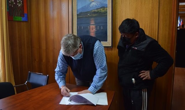 El alcalde manifestó que “firmamos el contrato con la empresa que se adjudicó la construcción de garitas en diferentes sectores rurales. Aprovechamos la oportunidad que estaba el dirigente de Challupen Bajo, sector El Escorial, Sabino Calfuñanco, protagonista de la firma del contrato, y quien nos ha solicitado estos trabajos en repetidas oportunidades, porque hace mucho tiempo vienen estas peticiones y ahora ya se hizo realidad. Por eso, estamos muy contentos”, señaló el edil.