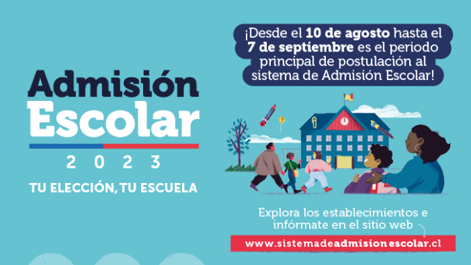 Este miércoles 10 de agosto comienza el periodo de postulación para la Admisión Escolar para el año 2023, que será a través de la plataforma web www.sistemadeadmisionescolar.cl y estará disponible hasta el miércoles 7 de septiembre. Los apoderados que cuenten con RUN chileno y que deban postular por primera vez a sus hijo(as) ya pueden registrarse anticipadamente como usuarios y acceder a la información acerca de los establecimientos educacionales de acuerdo a sus preferencias.