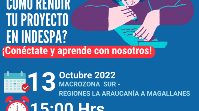 La jornada tendrá lugar este jueves 13 de octubre de 2022, entre las 15:00 y 16:30 horas, y es dirigida principalmente a organizaciones y personas que han sido beneficiadas con iniciativas de Indespa, entre las regiones de La Araucanía y Magallanes.
