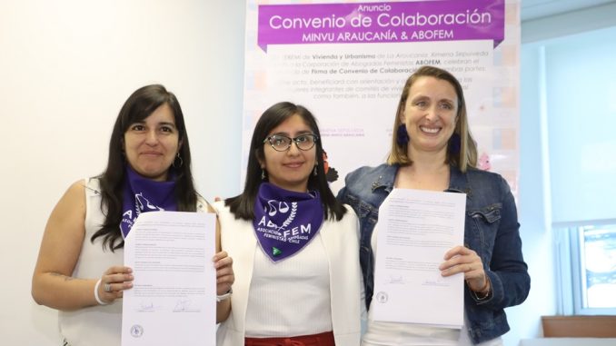 La SEREMI de vivienda de la región de La Araucanía, Ximena Sepúlveda Varas junto a la Corporación de Abogadas Feministas ABOFEM, celebraron el anuncio de la Firma de Convenio de Colaboración entre ambas partes. Acuerdo que tiene como principal propósito beneficiar con orientación y asistencia jurídica a las mujeres integrantes de los distintos comités de vivienda de toda la región, así como también a las funcionarias del propio Ministerio (Seremi – Serviu).