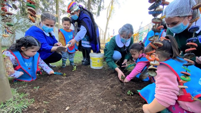 En la ceremonia, específicamente en el patio exterior, se vivió la actividad pedagógica “Mapu Kuzau – Trabajando en la tierra”, donde los niños y niñas protagonizaron el respeto y cuidado por el medio ambiente, promoviendo el contacto con la tierra y los seres vivos.