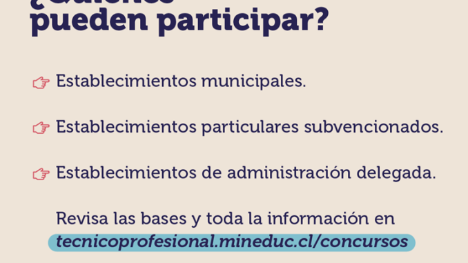 Los establecimientos interesados en concursar y que impartan Educación Media Técnico Profesional pueden revisar las bases de postulación disponibles en https://tecnicoprofesional.mineduc.cl/concursos /