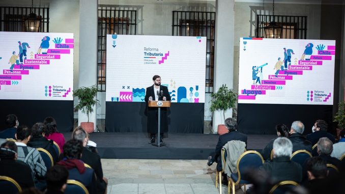 El Presidente Gabriel Boric junto al ministro de Hacienda Mario Marcel anunciaron esta mañana en el Palacio de La Moneda el contenido de la reforma tributaria, la primera de las reformas estructurales de su administración con la que espera recaudar del orden de 4,1 puntos del PIB cuando esté completamente en régimen.