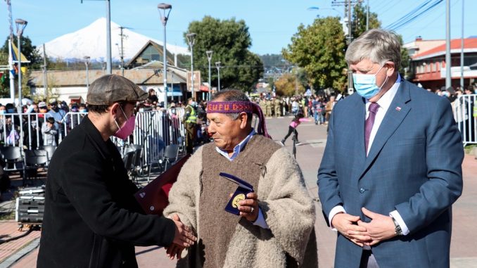 Allí, encabezaron la ceremonia, el Delegado Presidencial de La Araucanía, Raúl Allard; el Gobernador regional, Luciano Rivas y el jefe comunal anfitrión, junto al grupo de concejales, el edil de Pucón, Carlos Barra y el de Curarrehue, Abel Painefilo, representantes de parlamentarios, autoridades policiales, militares y, de manera especial, quienes recibieron -en esta misma jornada- la Medalla Jerónimo de Alderete y preseas de reconocimiento por su aporte al desarrollo de la ciudad.