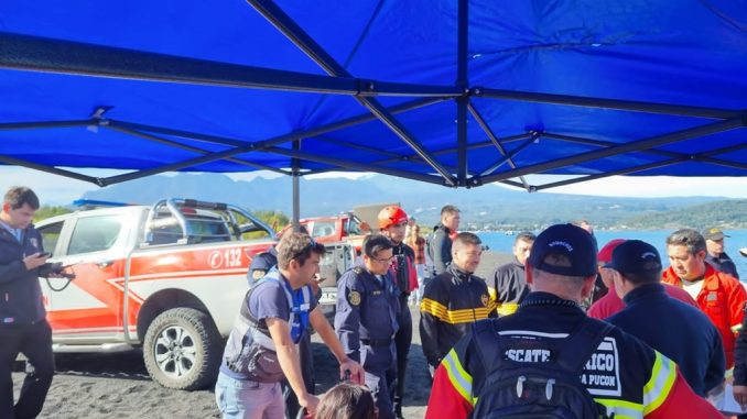 “ Se continúa la búsqueda del profesor con equipos técnicos de rescate subacuáticos de bomberos de Pucón, Villarrica, Pto Saavedra y Mininco, entre otros. Además está trabajando la Armada y un robot submarino con el cual está operando el Gope de Carabineros y estamos a la espera de la confirmación de otros recursos, trabajos que están siendo coordinados por el equipo de emergencias del Municipio de Pucón y la Capitanía de Puerto Lago Villarrica”.
