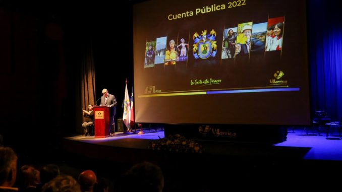El reciente día miércoles, en Villarrica, el alcalde de la comuna lacustre, Germán Vergara, presentó una contundente Cuenta Pública de su última Gestión Municipal 2022, la que fue muy aplaudida por un repleto Liquen Centro Cultural Municipal, al cual asistieron dirigentes vecinales y autoridades, encabezadas por el Delegado Presidencial, José Montalva; el administrador del Gobierno Regional (Gore), Carlos Fuentes, en representación del Gobernador Regional, Luciano Rivas; el consejero regional, Federico Figueroa; así como representantes de Carabineros, PDI, las iglesias católica y evangélica, bomberos y el director del Hospital de Villarrica, Jaime Bertolotto.