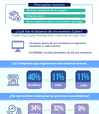 No obstante, la mayor parte de los reclamos se registran posterior al evento porque dicen relación con la falta de stock, retraso en la entrega o término unilateral del contrato. Por ejemplo, si tomamos en cuenta los tres eventos cyber pasados (Cyber Day y Cyber Monday del año 2022 y el Cyber Day de mayo de 2023), el SERNAC recibió alrededor de 20 mil reclamos en contra de las empresas participantes.