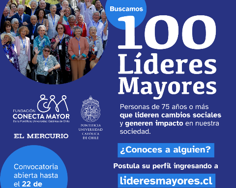 Por tercer año consecutivo, Conecta Mayor UC, El Mercurio y la Pontificia Universidad Católica de Chile, junto a la colaboración de TVN, Emol y Metro y el apoyo de Servicio Nacional del Adulto Mayor (SENAMA), la Sociedad de Geriatría y Gerontología de Chile y la Asociación Chilena de Municipalidades, presentan “100 Líderes Mayores”, reconocimiento que destaca a personas que, con su talento y experiencia, aportan al desarrollo del país y lideran cambios sociales.