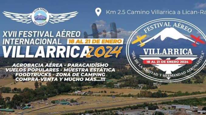 Entre este viernes 18 y el domingo 20 de enero se estará desarrollando en Villarrica la versión N°17 del Festival Aéreo Internacional Villarrica 2024, actividad tradicional que reunirá en el aeródromo villarricense (kilómetro 2.5 de la Ruta Villarrica Lican Ray) a los mejores cultores de la actividad aeronáutica civil de Chile y, además, de países invitados, como Brasil, Argentina, Uruguay y Paraguay.