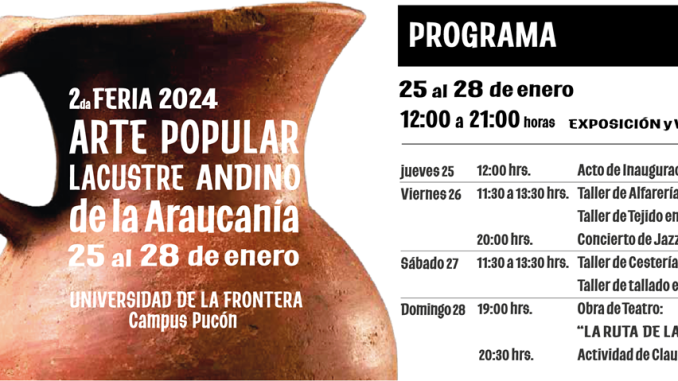 Entre el jueves 25 y el domingo 28 de enero se realizará la Segunda Feria de Arte Popular Lacustre Andina – Araucanía 2024, al interior del Campus Pucón de la Universidad de La Frontera. La actividad reúne a 21 artesanas y artesanos de las comunas de Curarrehue, Pucón, Villarrica, Cunco, Melipeuco y Lonquimay que desarrollan sus oficios con las materialidades más características del territorio.