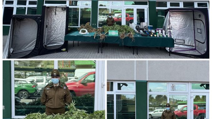 “Se procedió a la detención de un hombre por infracción a la Ley 20.000, hombre adulto de 37 años chileno y con domicilio en la comuna de Villarrica, se decomisaron elementos para probar el delito de cultivo de drogas, como también ramas en proceso de secado de casi un metro y 2,790 kilos de marihuana a granel”, destacó el Capitán Jessy Carrillo de la 7ª Comisaría Villarrica.
