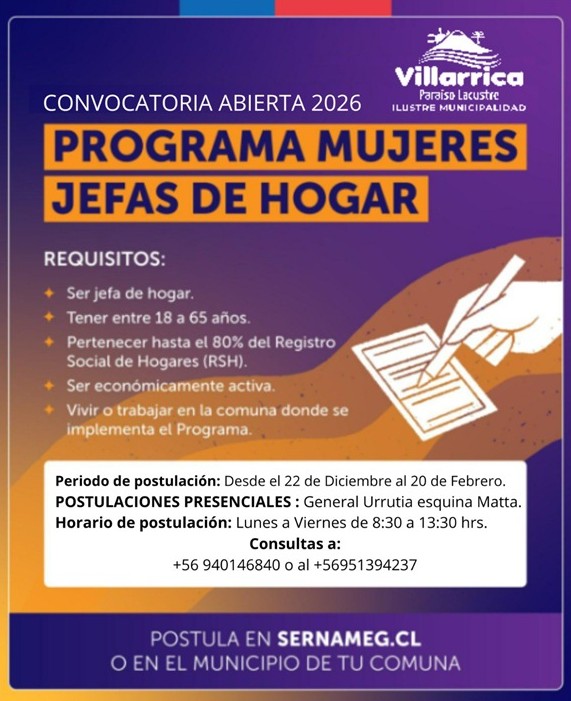 La Municipalidad de Villarrica informa que se encuentran abiertas las postulaciones al programa Mujeres Jefas de Hogar Villarrica 2026, que ejecuta el municipio local en convenio con Sernameg. Las interesadas deben tener un rango etario de entre 18 y 65 años y deben inscribirse en forma presencial en las oficinas ubicadas en calle Matta esquina Urrutia.