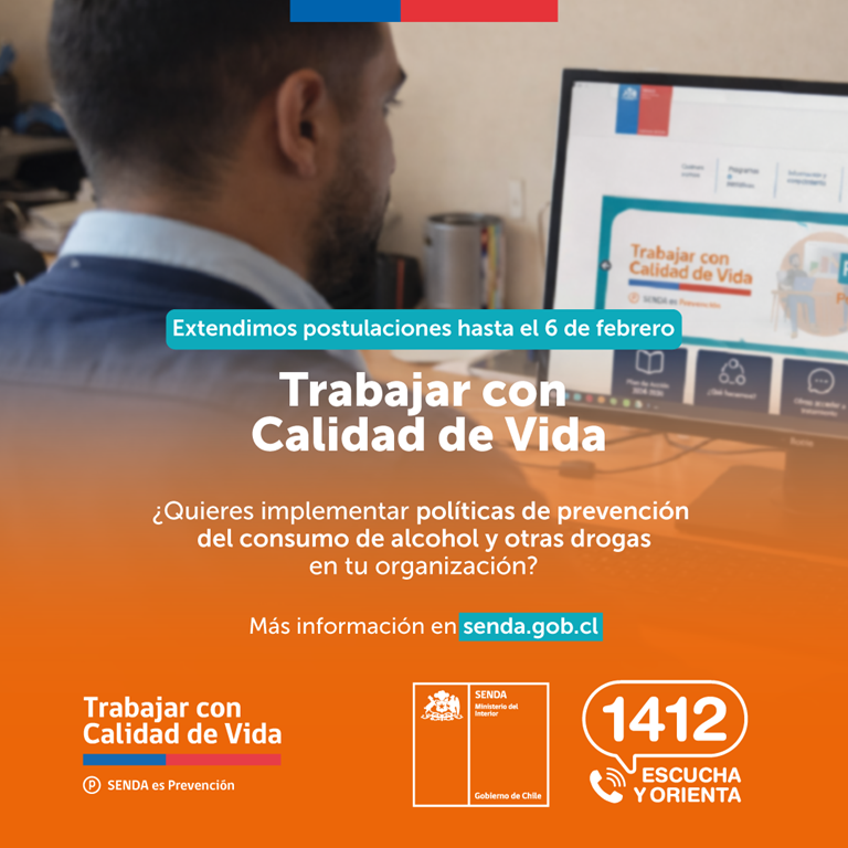 El Servicio Nacional para la Prevención y Rehabilitación del Consumo de Drogas y Alcohol (SENDA) amplió el proceso de postulación al Programa Trabajar con Calidad de Vida (TCV) 2026, iniciativa dirigida a organizaciones públicas y privadas de todo el país interesadas en implementar acciones preventivas en sus espacios laborales.