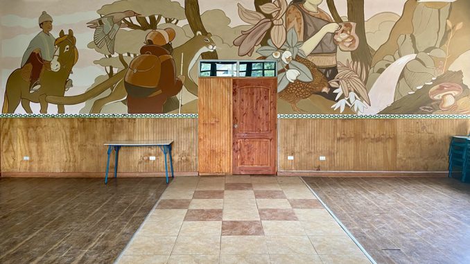 Uno de los sellos más particulares del mural fue su materialidad. La obra fue pintada con tintes naturales elaborados a partir de arcillas y tierras recolectadas en distintos puntos del territorio, como el lago Villarrica y sectores como Chesque, Nalcahue, Liumalla y Hualapulli, además de algunos pigmentos provenientes de la zona central. Si bien este tipo de pinturas se utiliza habitualmente en muros de bioconstrucción, en esta ocasión se aplicó sobre paredes de cemento al interior de la escuela, logrando —según el equipo— una atmósfera cálida y acogedora.